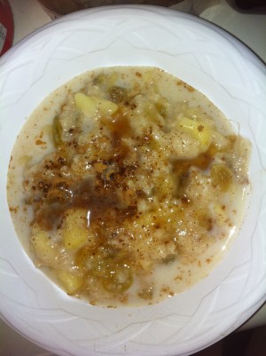 Im up this morning looking at recipes in the “Fork Over Knives” book. I watched the movie on Netflix this morn and I’m convinced that the vegetarian lifestyle is a right move for me. I selected the Cinnamon and Raisin Rolled Oats Recipe. I adapted it a little because I’m so used to the way Mom made oatmeal when I was a lil girl.