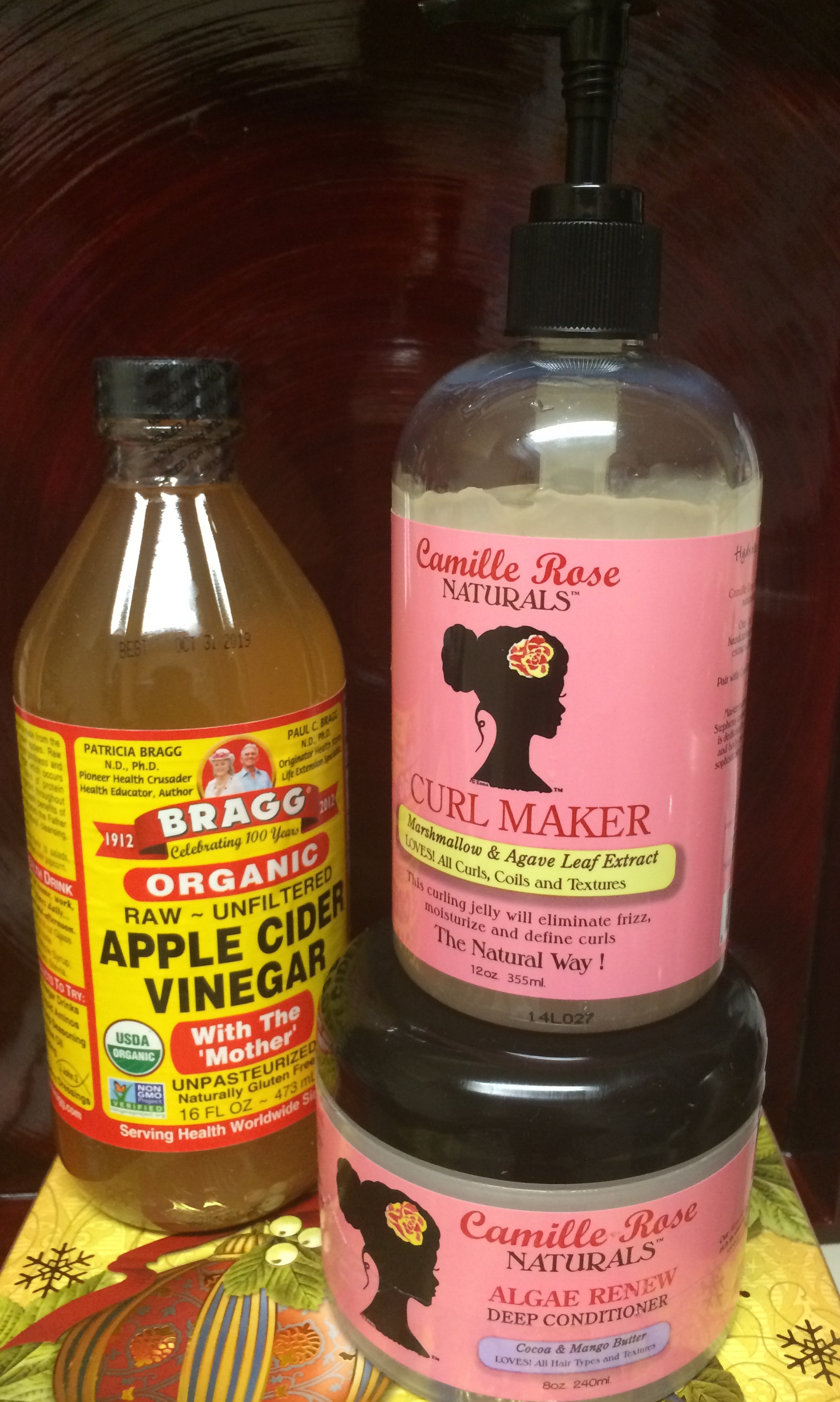 My current natural hair products are working very well for me.  I can’t live without my Apple Cider Vinegar, Kinky Curly Leave-In (not pictured).  I revisited the Camille Rose Deep Conditioner.  I’m still not sure if I like it.  But, I did like the Camille Rose Curl Maker.  Loving it!